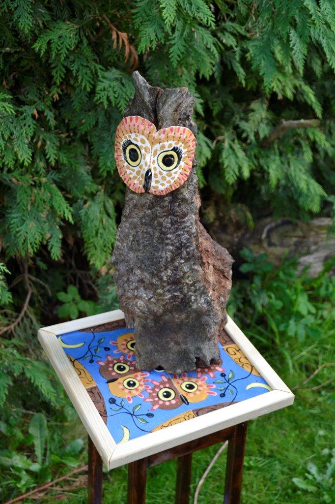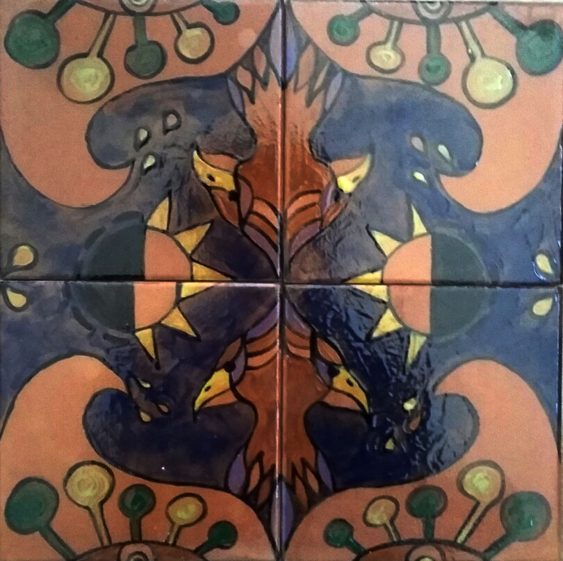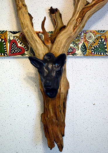 Dan begint ergens het componeren, het toevoegen en het scheppen. Wat raakt me, wat trekt me aan? En daar verder op doorwerken: geulen, gaten en aparte delen zichtbaarder maken door opschuren, zagen, bewerken, beschilderen en andere materialen toevoegen. De laatste tijd ontstaan er vaak (verwijzingen naar) dieren. Wat vertelt zo?n dier me, welke krachten zijn er te ontdekken? Observeren en lezen over die dieren, hoe ze leven in de vrije natuur. Maar ook hoe mensen in verschillende culturen dachten en nog steeds denken over die dieren. Er komt een proces op gang, dat me doet verlangen naar het verbeelden op een grafische manier en in teksten. Betekenis geven, metaforen in vormen en kleuren, componeren met ritmes en herhalingen. Terug te zien in de tegels en de gedichten bij de beelden.”